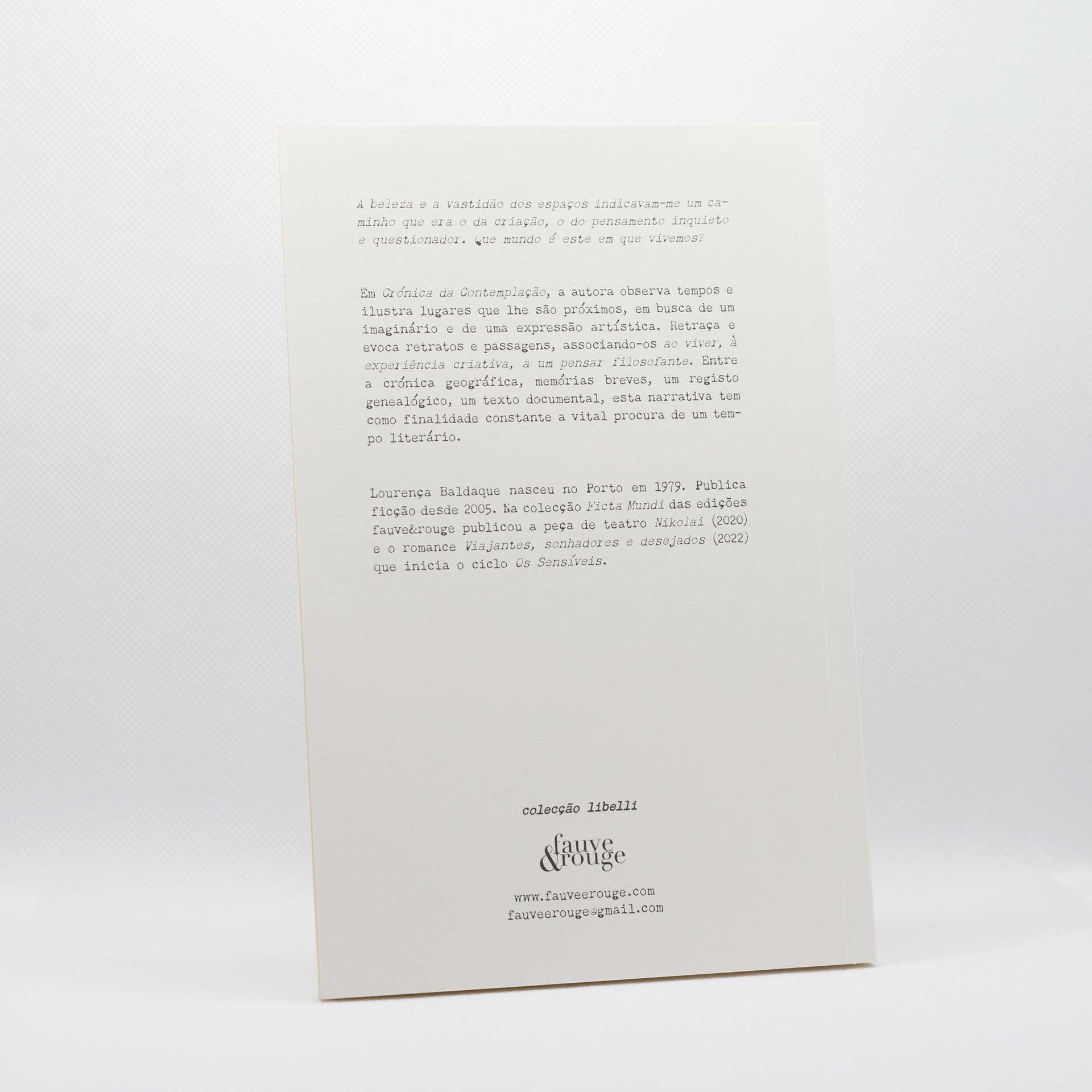 Lourença Baldaque nasceu no Porto em 1979. Publica ficção desde 2005. Na colecção Ficta Mundi publicou a peça de teatro Nikolai (2020) e o romance Viajantes, sonhadores e desejados (2022) que inicia o ciclo Os Sensíveis.